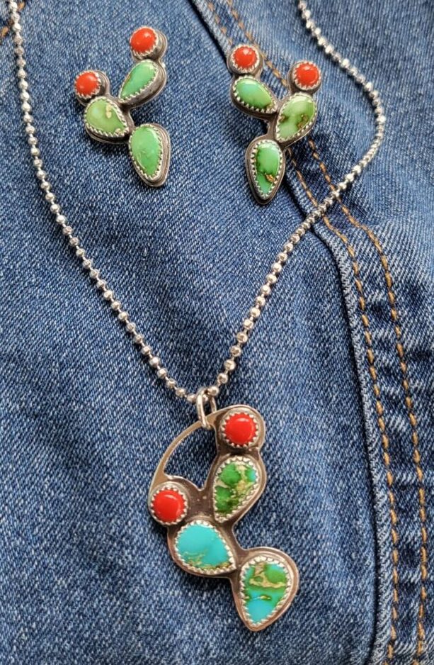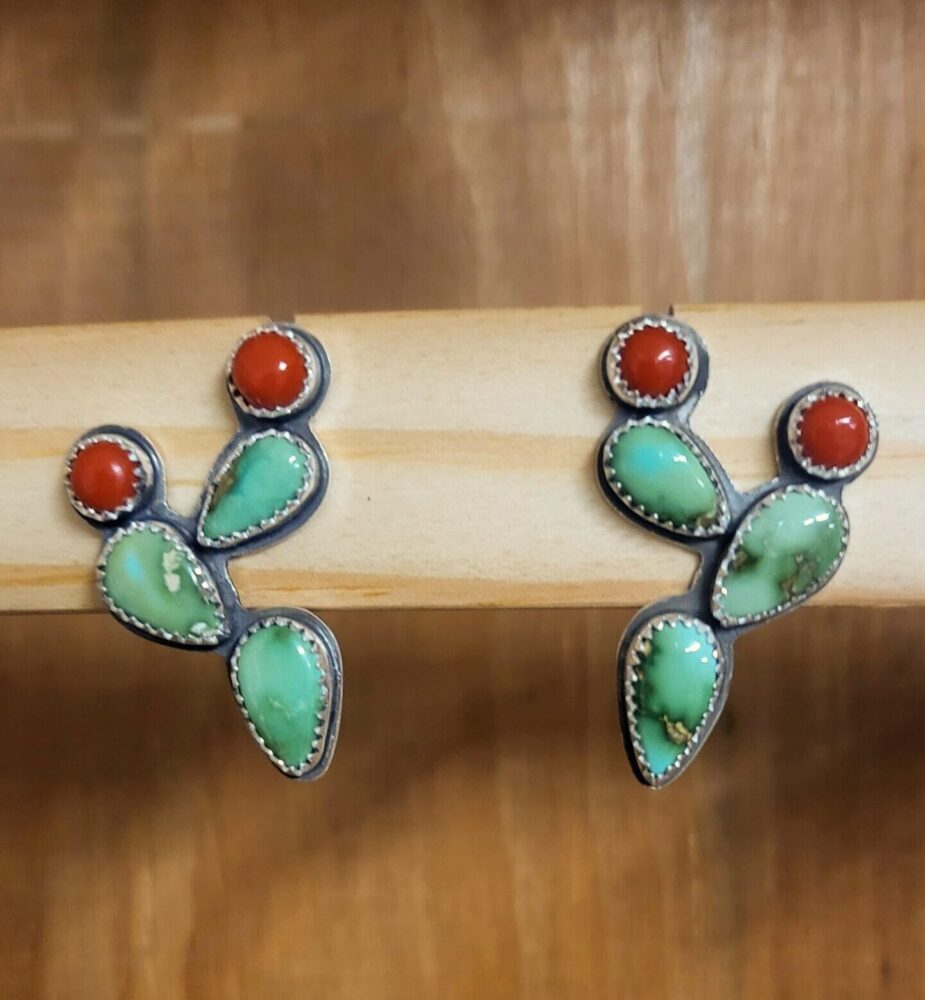 Cactus earrings made with Sonoran turquoise and Italian coral. Matching necklace sold separately. Length of earrings is 1 1/4″