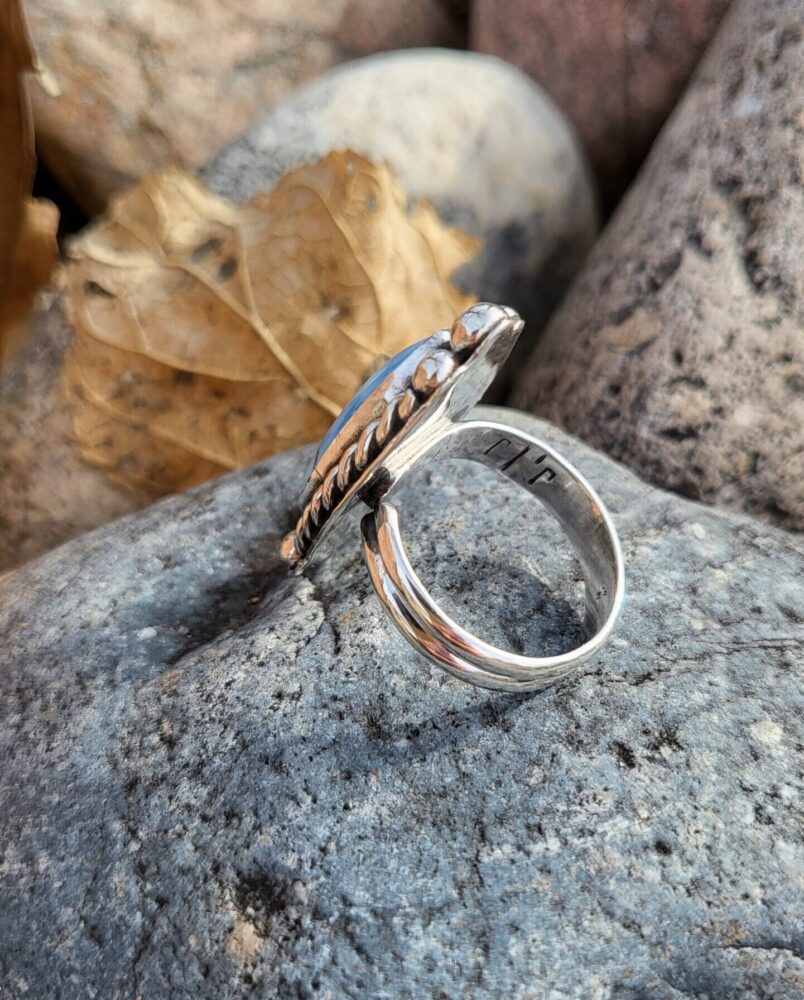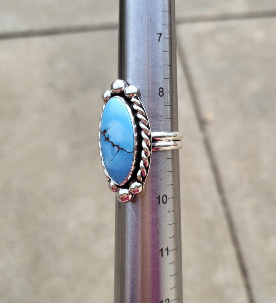 This natural Golden Hills ring is the prettiest blue with a beautiful matrix and adjustable band will fit most. Materials also include fine and sterling silver. The band can be adjusted up to size 9.