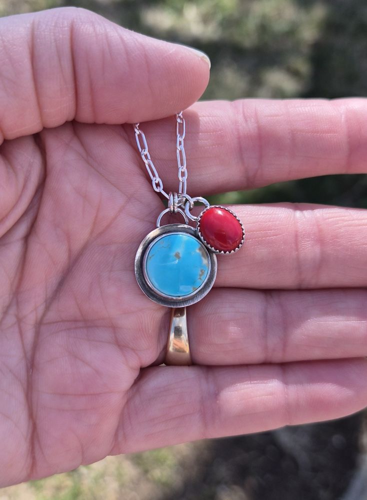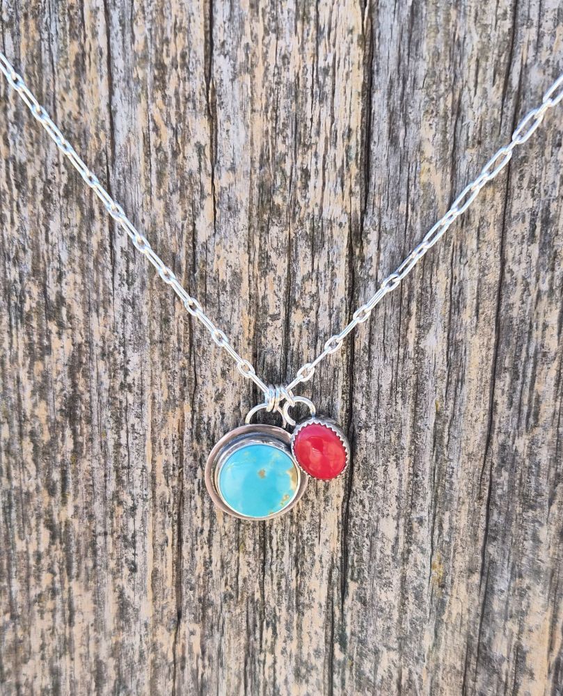 Natural Kings Manassa turquoise and Italian coral necklace. Made with fine and sterling silver with a long short sterling 18″ chain.
