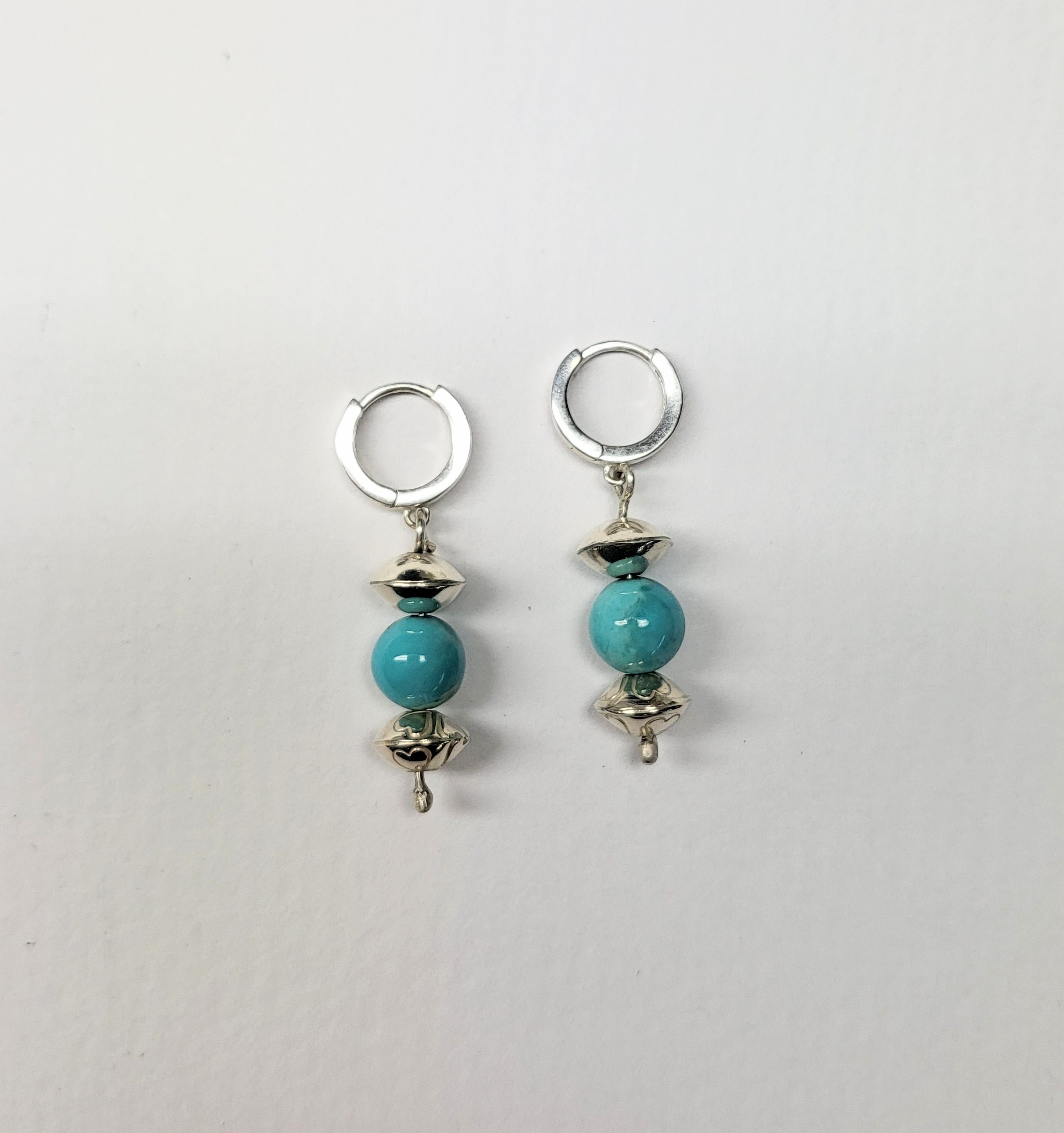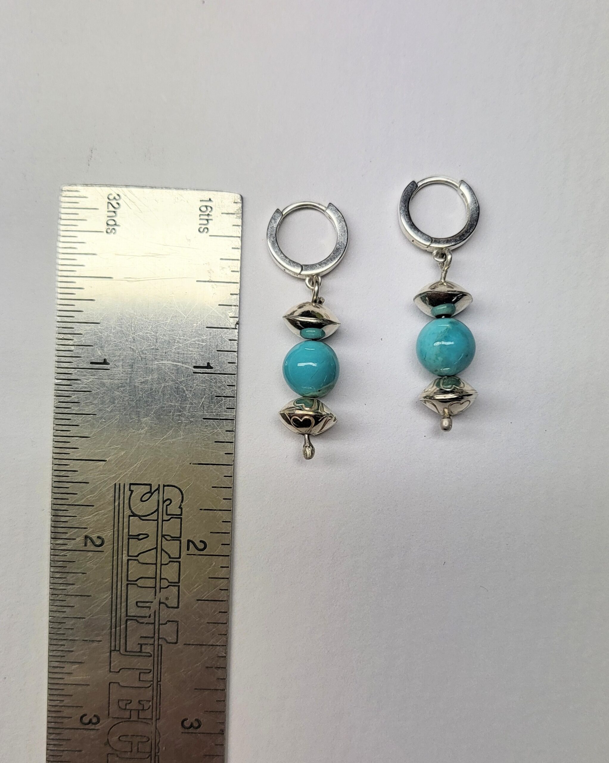 Huggie Hoops with silver beads that are hand made by me! The bottom bead has little hearts stamped on them. They also have bright blue Kingman turquoise beads. Not too big, not to small.