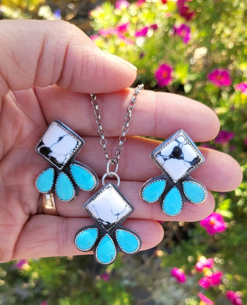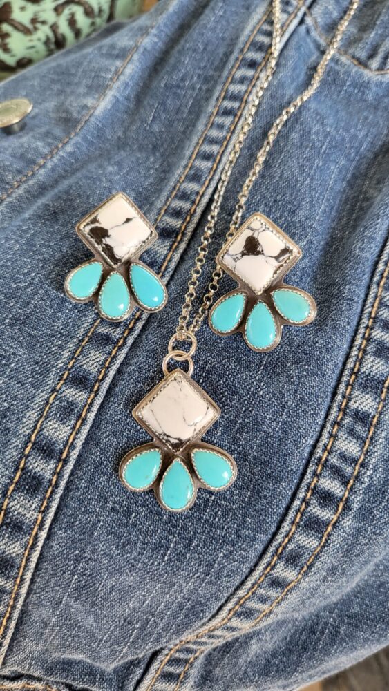 White Buffalo and Blue Nacozari stone set to contrast on an 18″ chain and the earrings with posts. Lightweight and beautiful!