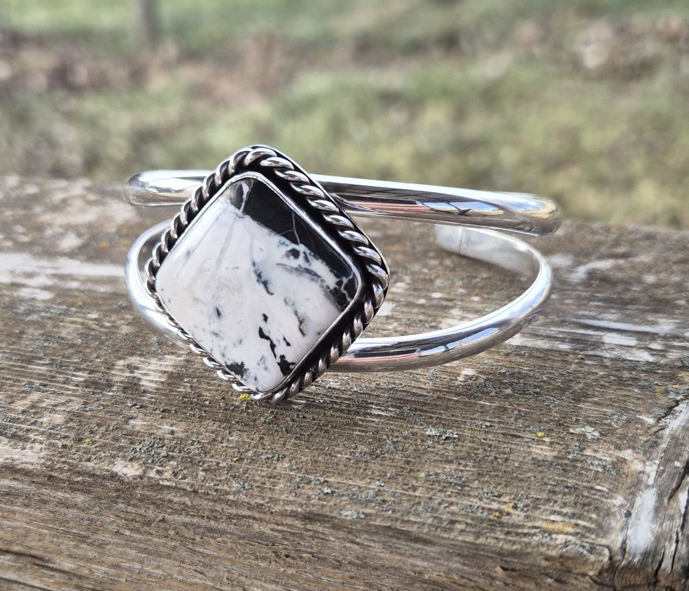 Statement sized natural White Buffalo cuff made with fine and sterling silver. This cuff fits medium to large wrists.